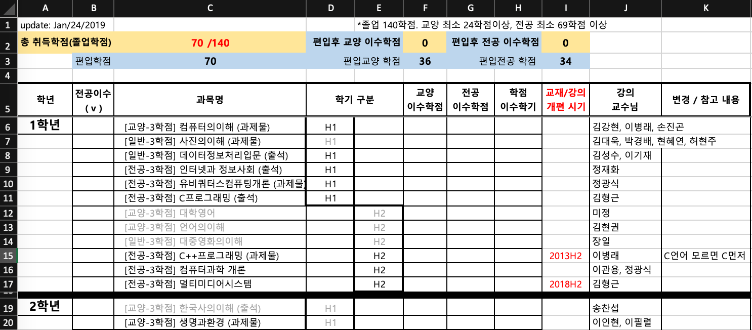 마치며 아래는 전체 학년, 학기별로 개설된 강의 표를 만들기위해 제가 참고했던 방법과 수강계획 파일입니다. 이해와 학습에 도움이될지 몰라 남겨드립니다. 다음 글에서 또 뵙겠습니다.