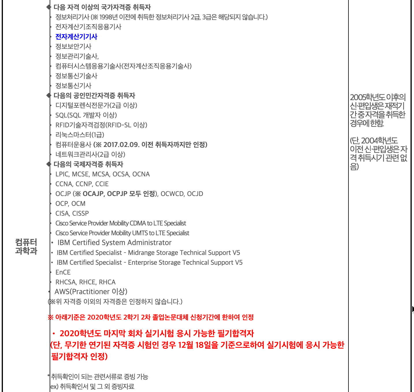마지막으로 컴퓨터과학과의 졸업을 위한 논문 대체 자격증은 아래와 같으며, 입학 이전에 취득한 자격증은 졸업 논문 대체로 사용할 수 없습니다. 따라서 신입/편입을 하셨다면 미리 어느 자격증으로 대체할 수 있는지 확인 후 학기중에 미리 취득하시면, 마지막 기말시험이 끝나며 논문쓰지 않고, 자격증 제출로 졸업을 하실 수 있습니다. 시간과 비용을 들여 취득할 자격증이니 어떤게 더 관심있고 유리한지 생각 보시는게 좋겠죠?^^