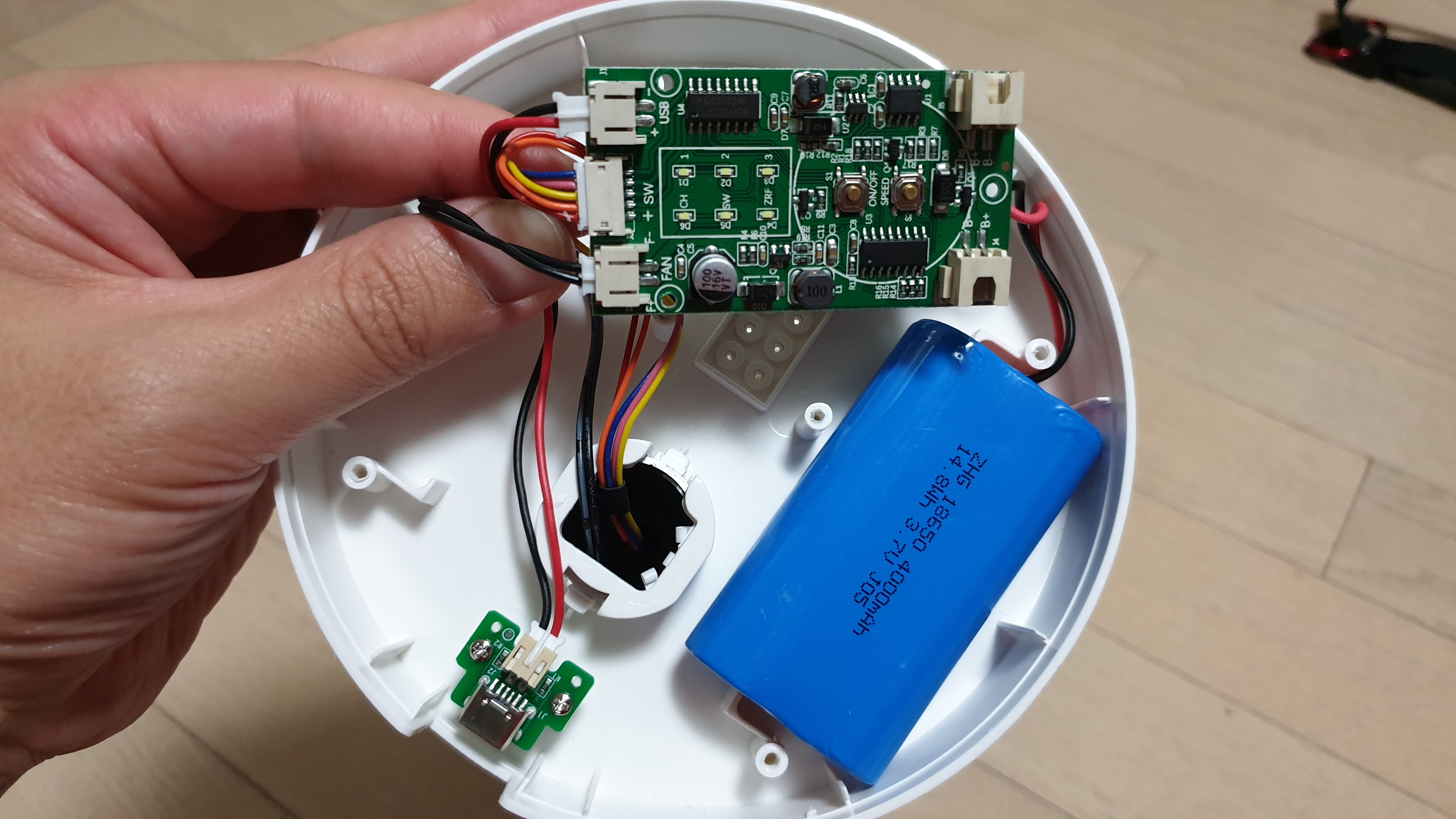 손가락 있는 부분이 USB충전과, 버튼 스위치, Fan 제어용 연결이고