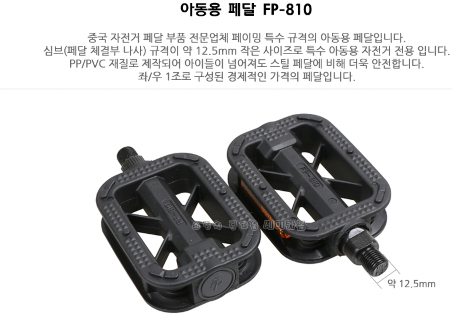 기존 자전거(로얄베이비)의 페달 나사선 지름은 약 12.5mm 인데 일반 자전거용 페달은 14.5mm 정도 된다. 따라서 좀 더 작은 지름의 호환되는 페달로 다시 구매하게 됐다. 사진은 이번 교체를 위해 주문한 페달의 설명 페이지의 일부인데 안내된 글과 같이 일부 어린이용 자전거에 12.5mm 를 사용중이라 페달 주문에 미리 확인과 주의를 안내해주고 있다.